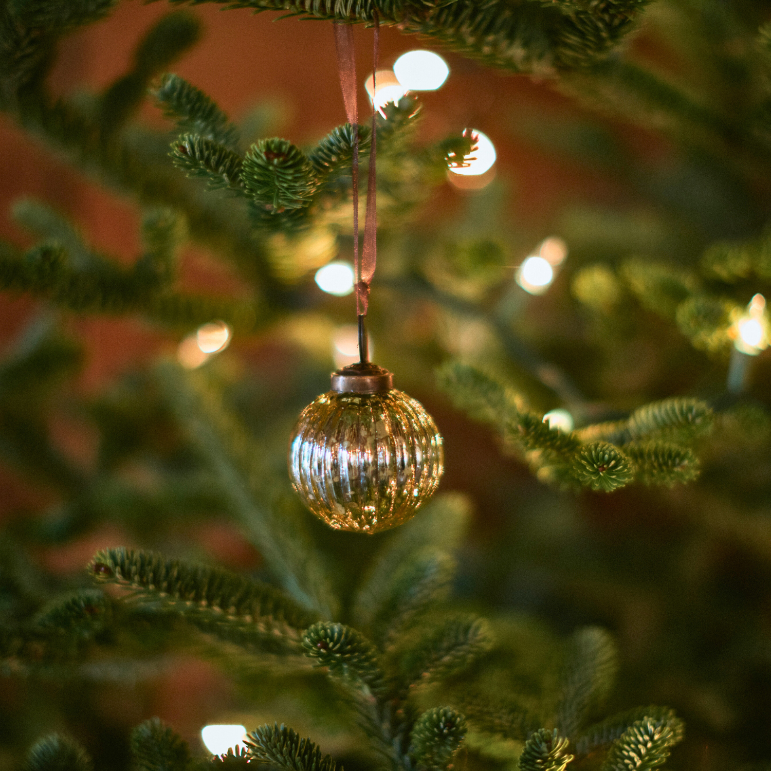A Medium sized hand-blown ribbed glass christmas tree bauble. Approximately 5cm in size with an ornate bronze cap and co-ordinating coloured organza ribbon. Beautiful Colourful glass Christmas Ornament or Christmas Decoration that can be hung all year round