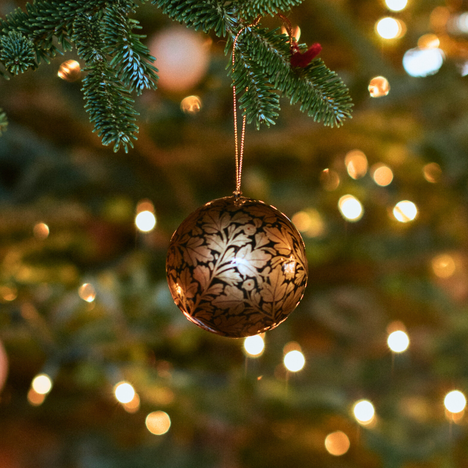 A beautifully hand-painted 3" (7cm) bauble decoration. Hand-crafted using traditional methods with paper mache, and painted by skilled artisans in Kashmir, India. These decorations are all hand-made from start to finish, and will of passed through many different hands on its journey. This image is of the design shown, as this is a hand-made, and hand-painted product, slight deviations in colouring, and design may arise.