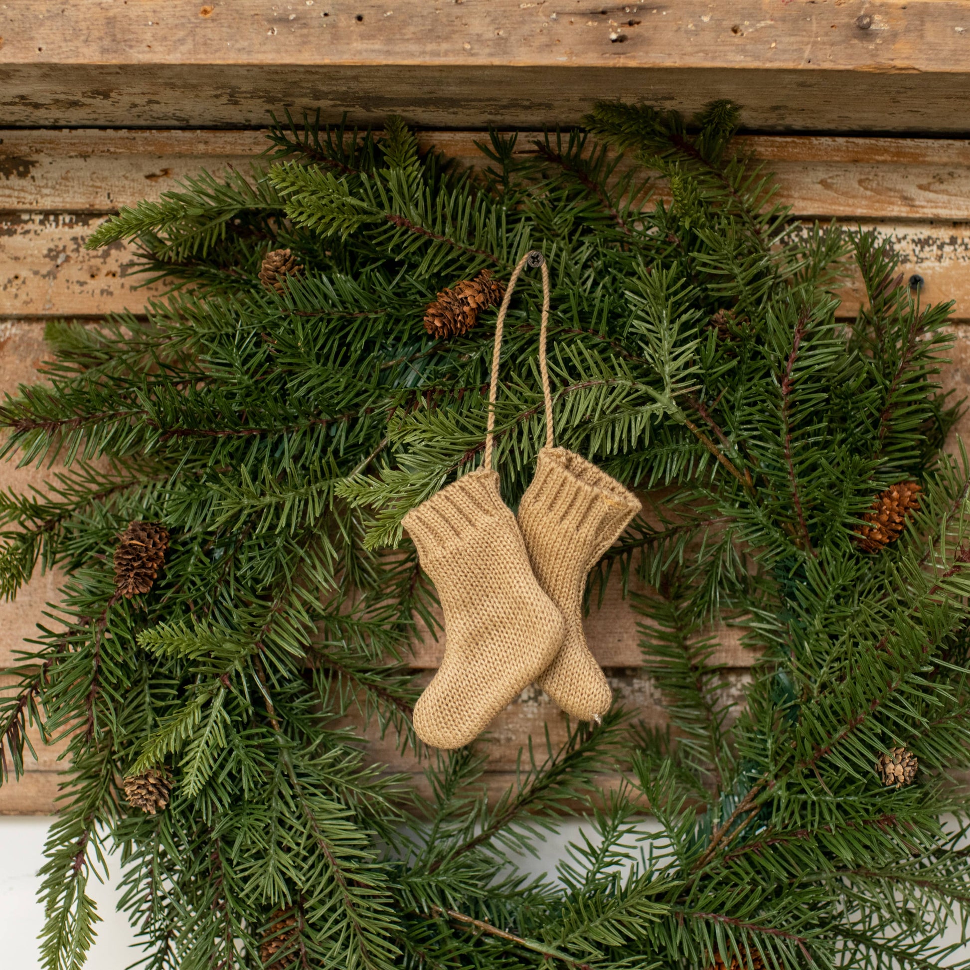 4" Tan Stocking Ornament. Crafted with attention to detail, this ornament embodies the warmth and charm of winter and Christmas. Its yarn composition adds a cozy touch to your tree decoration.