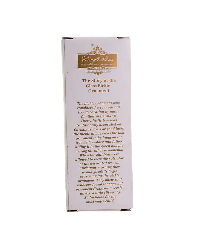 Delight in the holiday spirit with our 4" Hand Blown Glass Pickle Ornament from Kurt S. Adler, Inc. As a family-run business with over 75 years in the industry, we're renowned for our holiday classics. This unique pickle ornament, beautifully hand-blown, is a testament to our commitment to quality and creativity. It's not just an ornament, it's a piece of holiday tradition from a brand that knows Christmas inside and out. Perfect for adding a quirky touch to your festive decor.