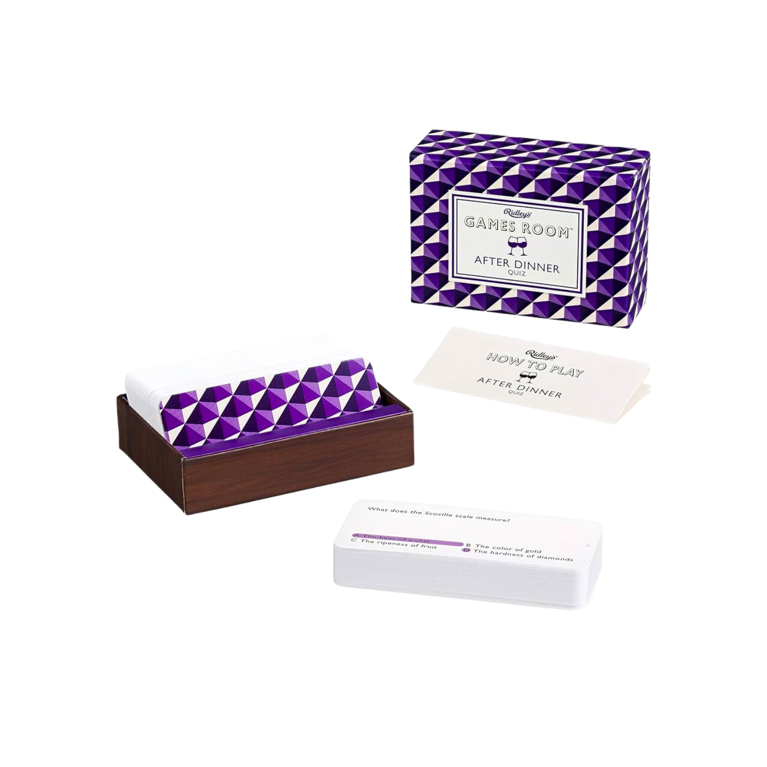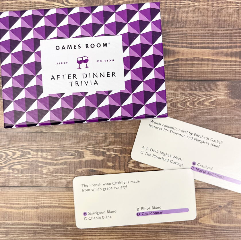 The After Dinner Quiz game is a lot of fun at parties or for family entertainment. The trivia questions test general knowledge of everything from literature to wine to cars. Each card gives multiple-choice answers to prompt players or have players come up with the correct answer with no help. Add a timer to keep things interesting.