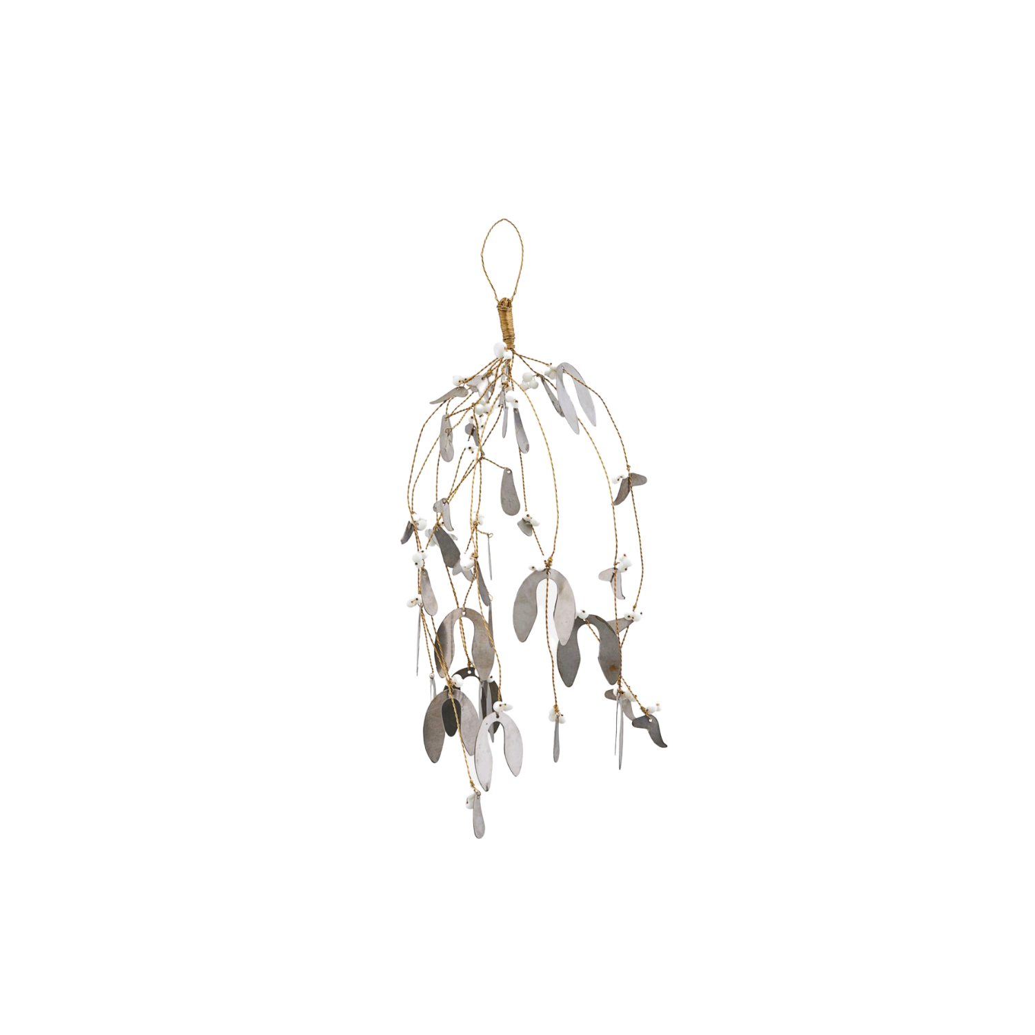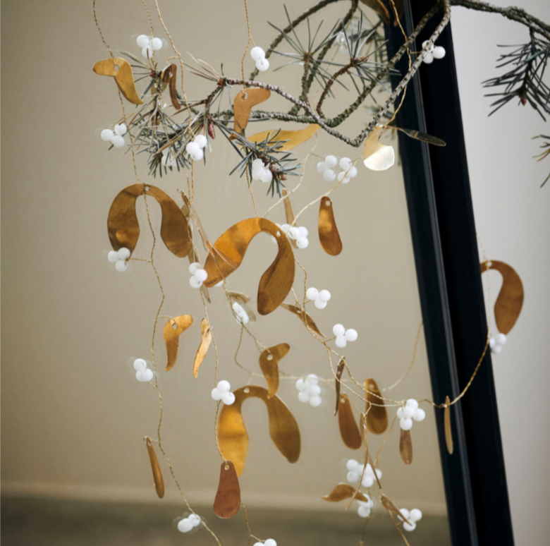 The mistletoe has an antique, metallic colour with small pearls in a white shade across the leaves.