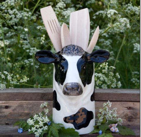 Cow utensil pot. Hand Painted Stoneware. Dishwasher Safe.