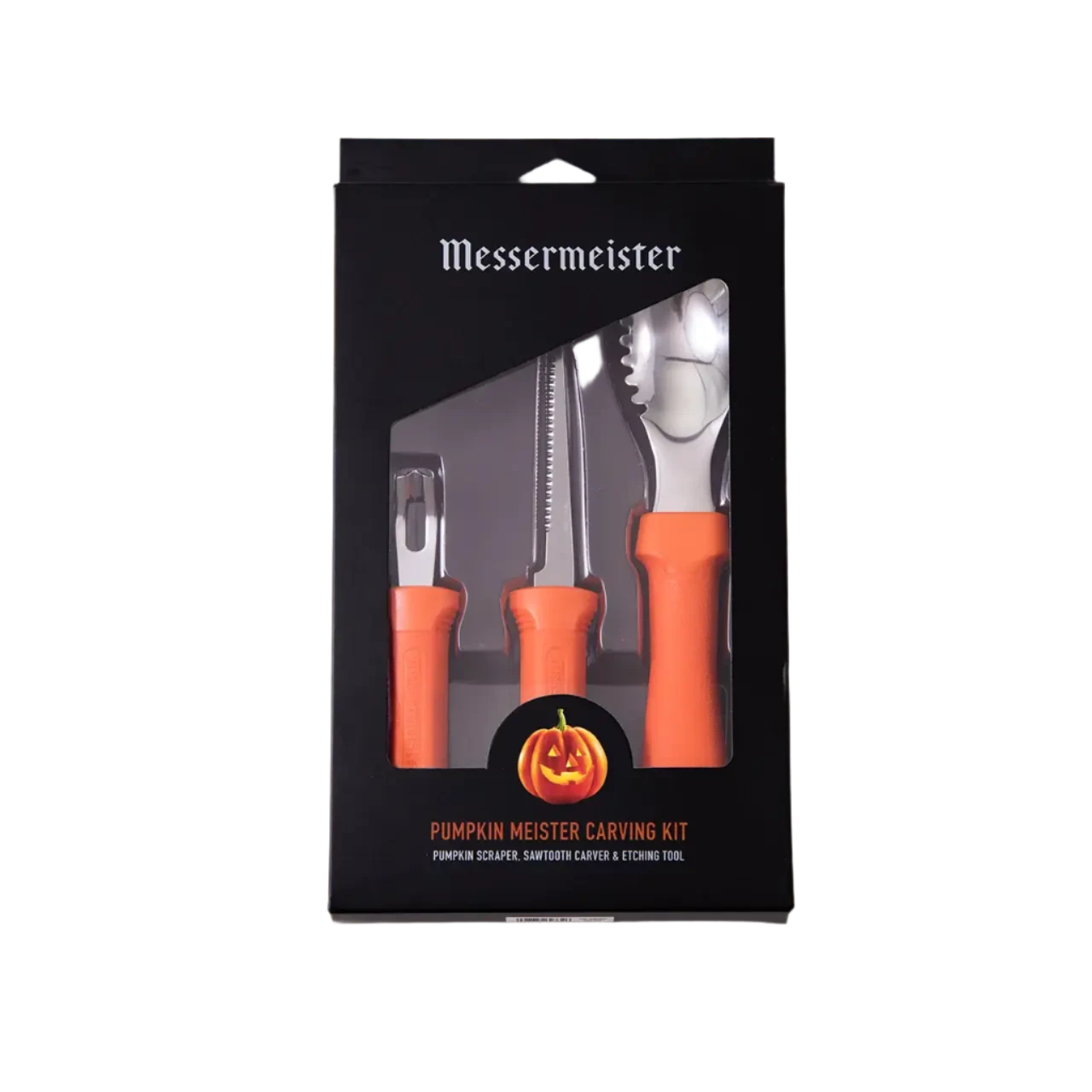 Become a Pumpkin Meister this Halloween with the Messermeister's pumpkin carving set! This 3-piece pumpkin carving kit utilizes 3 culinary tools that will bring out the artist in you! Prepare, carve and decorate pumpkins easier and safer when using these high quality chef's tools from Messermeister. The Pumpkin Scraper cleans seeds and pulp from pumpkins. It also thins walls of thick pumpkins, which allows carving tools to efficiently and safely execute cuts. The 3.5" Sawtooth Carver cuts out patterns & lids, trims edges and carves details. The long thin semi-flexible blade perfectly finishes all types of decorations. The Etching Tool has a curved squared up tool head with a sharp edge. It is perfect for scoring the skin in relief. It is great for names, numbers, eye brows and any fine detailed design that is a 3D shallow cut. Meister your pumpkin with these three tools! Features Stainless steel “AISI420” Large-size, soft-grip handle