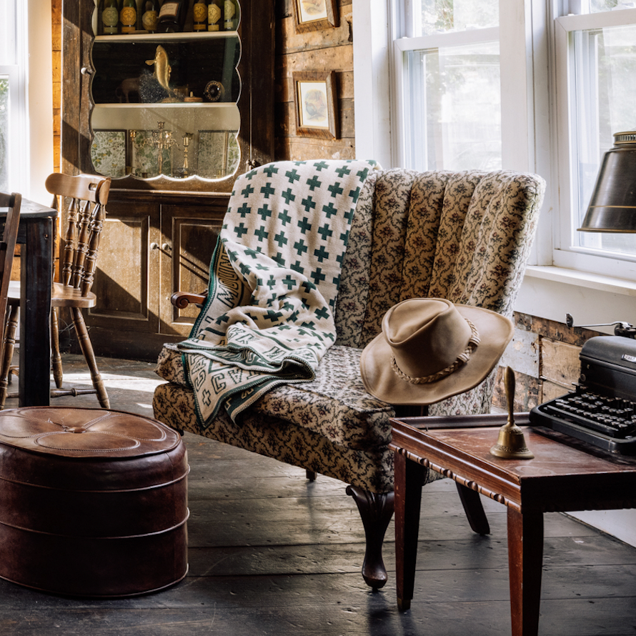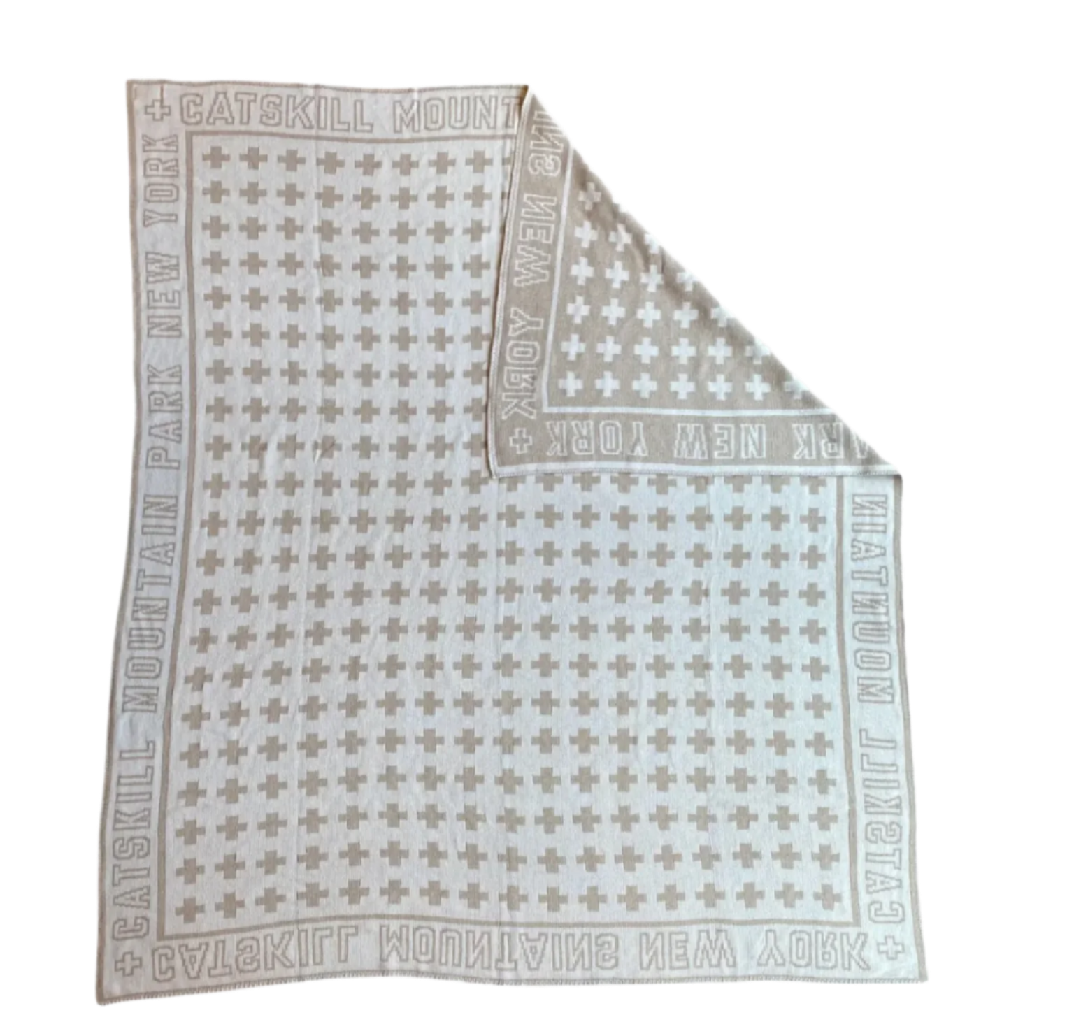 Homestedt camp blanket. A custom Homestedt design knit in Upstate New York with a reversible design. 50" x 60" , heavy weight and machine washable. Perfect for use as a fireside blanket, bedspread, or in the summer bring it with you outside as a perfect picnic blanket.