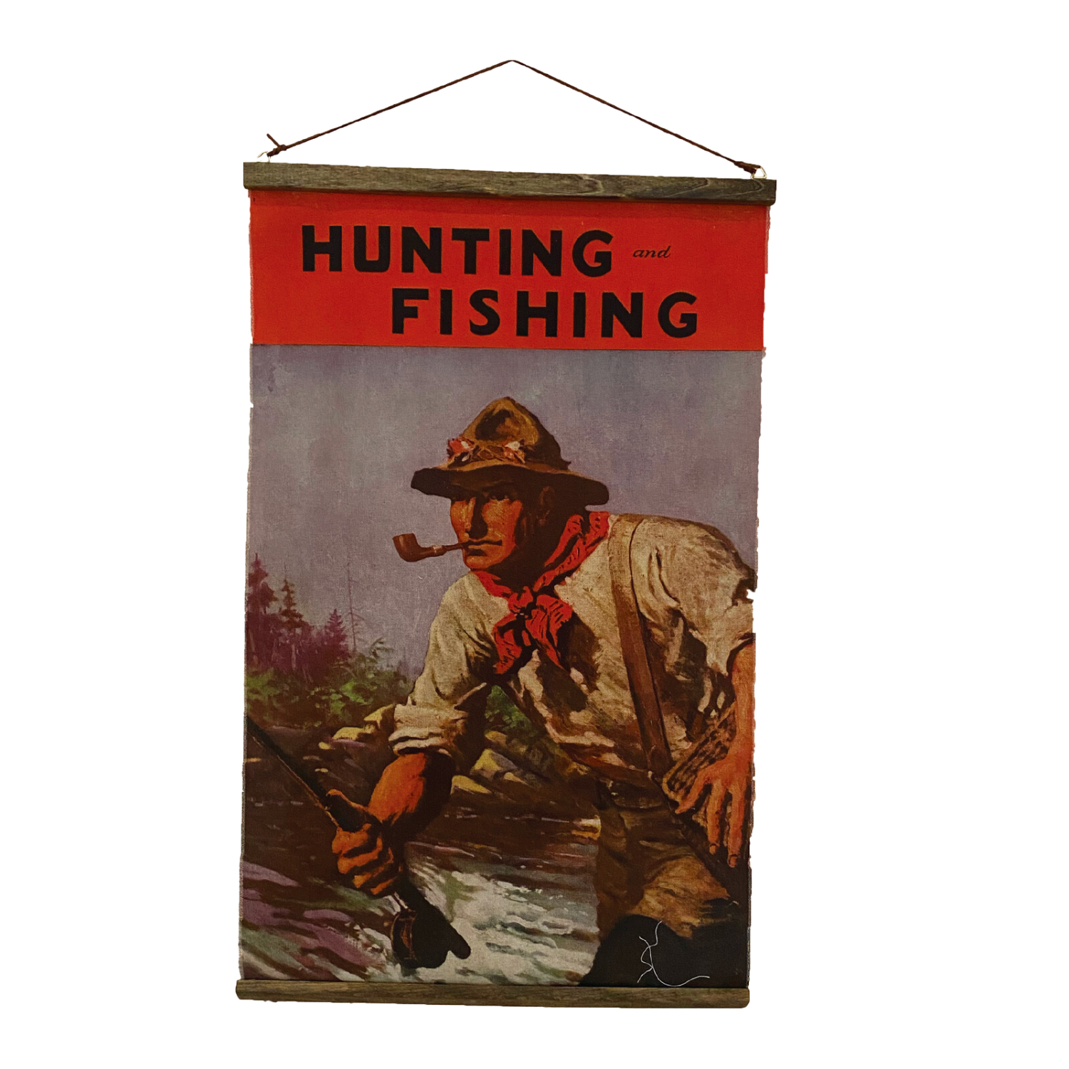 Hunting and Fishing illustration printed on canvas and comes ready to wall mount with wood framing top and bottom plus a hinged leather string for hanging.