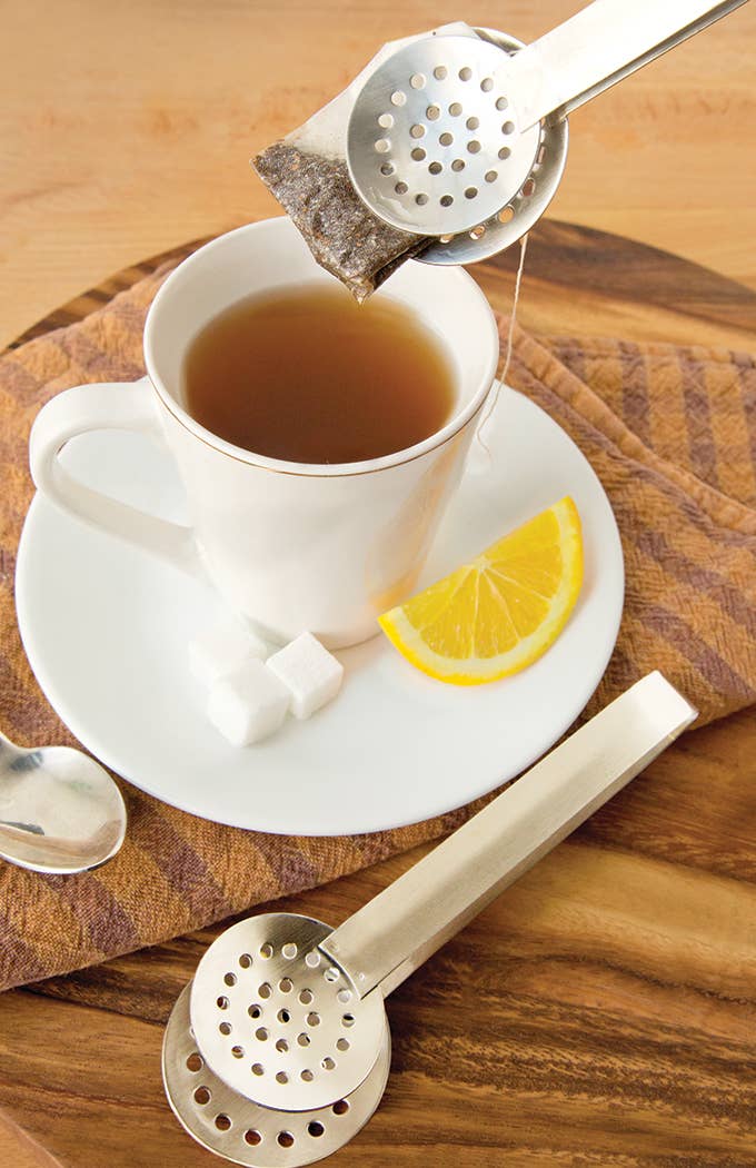 Enjoy a nice cup of tea morning, afternoon, and night with utmost ease. Our Tea Bag Squeezer is a true essential for anyone who consumes tea brewed from tea bags. Constructed of durable stainless steel, these small tongs allow you to grab the tea bag out of your teacup hassle-free and squeeze out every last drop for your enjoyment. When gently squeezing the tongs, the applied pressure assures that you will get the maximum benefit from your tea bag, with minimal effort. Keep one at home and one at the office! Also can be used as ice or sugar tongs. Put an end to broken tea bag strings, burned fingers, and struggling to fish a dripping bag out with a spoon. Don't leave any goodness behind. Package Type: Card